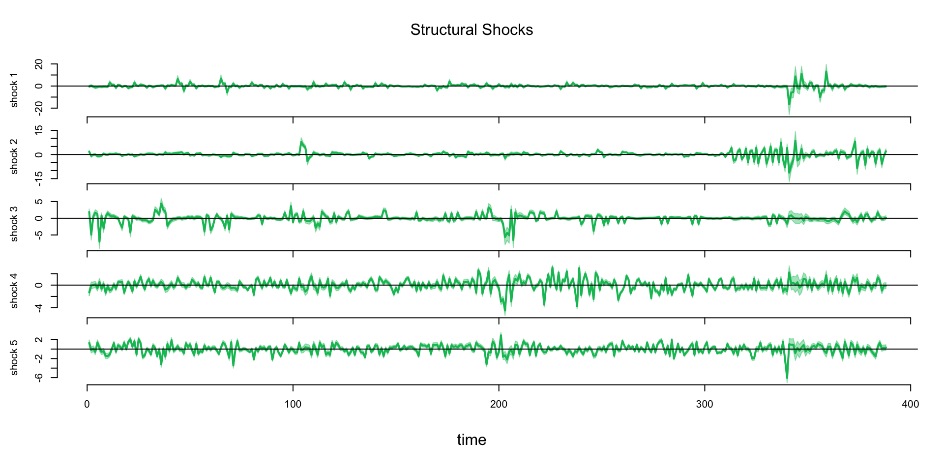 \[\begin{align} \begin{bmatrix}rgdp_t \\ cpi_t \\ CR_t \\ EX_t\\ aord_t \end{bmatrix} &= \dots + \begin{bmatrix} -&*&*&*&*\\ -&*&*&*&*\\ +&*&*&*&*\\ *&*&*&*&*\\ *&*&*&*&*\\ \end{bmatrix}\begin{bmatrix} u_t^{mps} \\ u_t^{*} \\ u_t^{*} \\ u_t^{*} \\ u_t^{*} \end{bmatrix} \end{align}\]