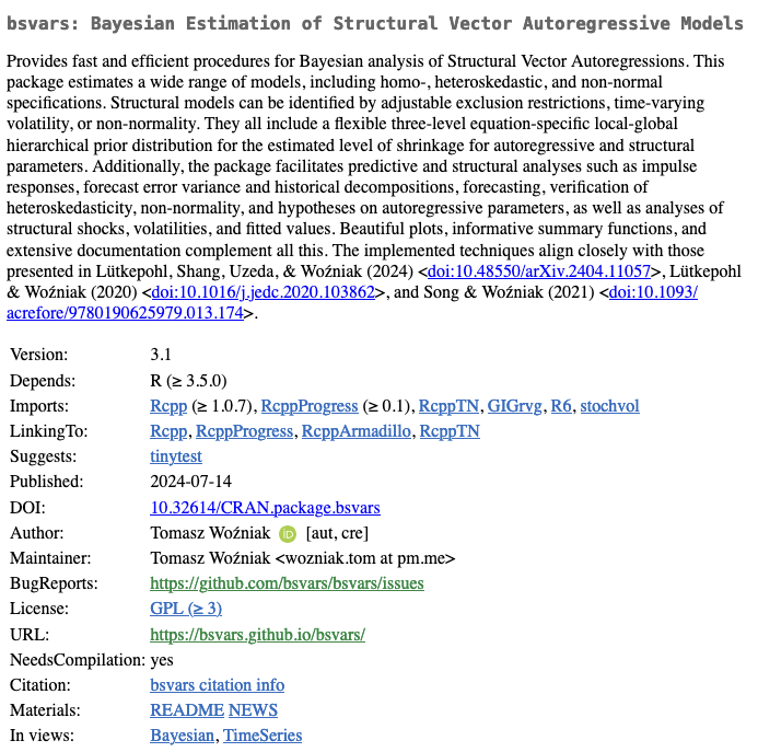 Assume the structural shocks are: \[\begin{align} \text{heteroskedastic: }&& u_t^{(i)}\mid\mathbf{Y}_{t-1} &\sim N(0,\sigma_{i.t}^2) \\ \text{non-normal: }&& u_t^{(i)}\mid\mathbf{Y}_{t-1} &\sim t(0,1, \nu_i) \\ \end{align}\]