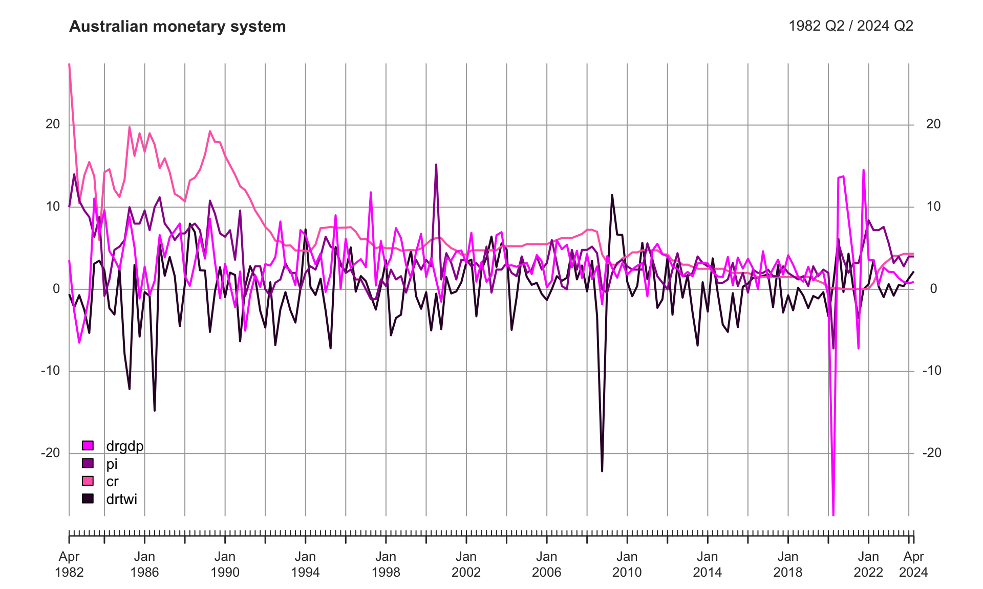 \[\begin{align} y_t = \begin{bmatrix} \Delta rgdp_t & \pi_t & cr_t & \Delta rtwi_t \end{bmatrix}' \end{align}\]