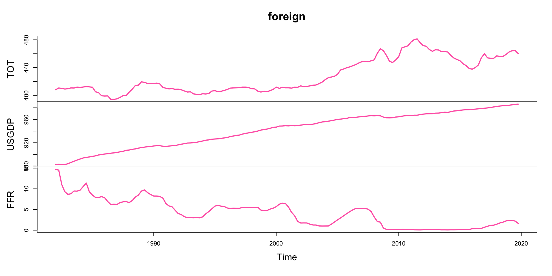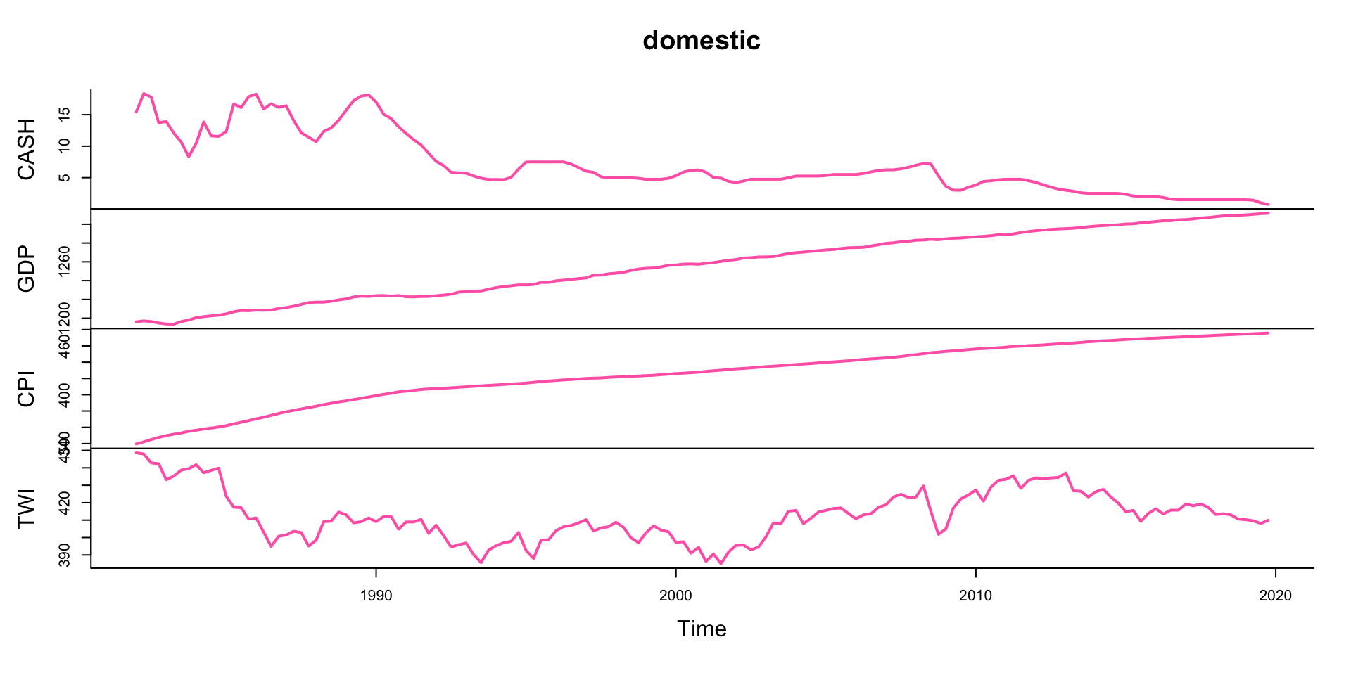 \[\begin{align} \text{dynamic equation: }&& y_t &= \mathbf{A}_1 y_{t-1} + \dots + \mathbf{A}_4 y_{t-4} + \mathbf{A}_d x_{t} + \epsilon_t\\[1ex] \text{domestic sector: }&& y_t &= \begin{bmatrix}\text{CASH}_t &\text{gdp}_t &\text{cpi}_t &\text{TWI}_t \end{bmatrix}'\\[1ex] \text{foreign sector: }&& x_t &= \begin{bmatrix}\text{TOT}_{t-i} &\text{gdp}_{US.t-i} &\text{FFR}_{t-i} \end{bmatrix}' \end{align}\]